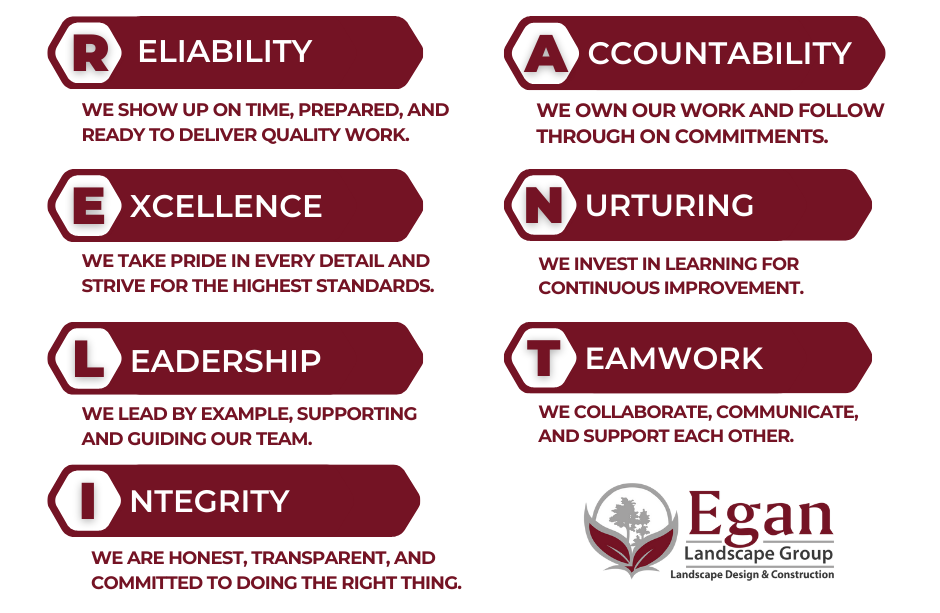At Egan Landscape Group, we pride ourselves on being more than just a landscape company. We are a dedicated team of professionals committed to transforming outdoor spaces while simultaneously building lasting relationships with our clients and one another. At the center of everything we do here at Egan Landscape Group are our core values that guide our approach to every project, every interaction, and every day on the job. These values are encapsulated in the acronym R.E.L.I.A.N.T., and they represent the foundation of who we are and how we operate.