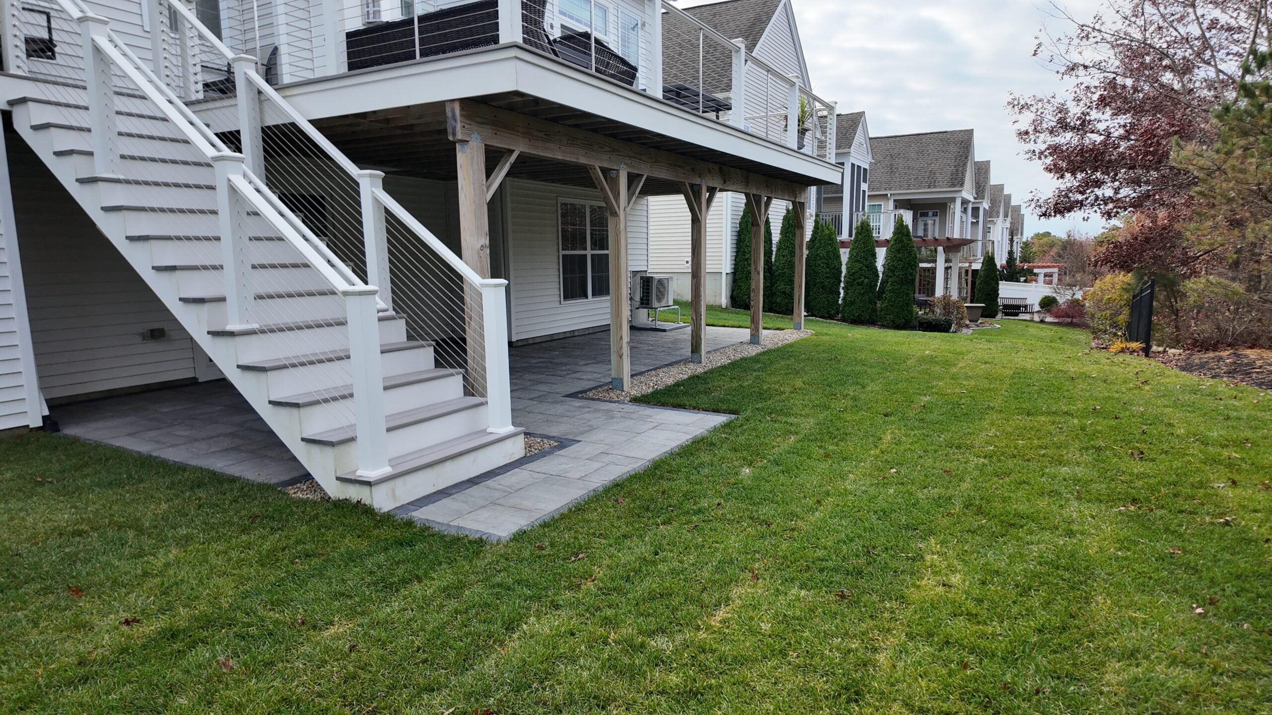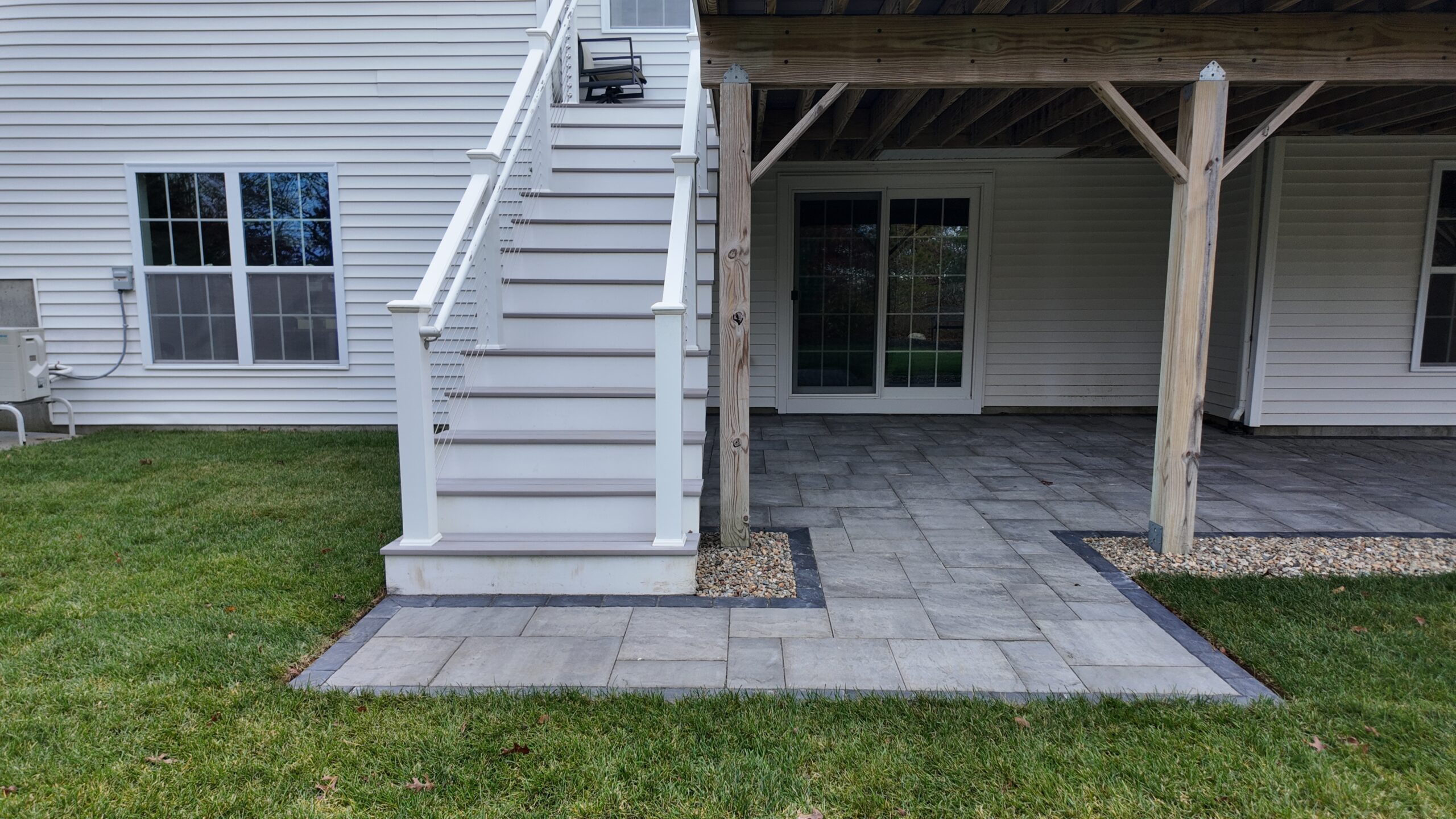 The homeowners were ready to transform their underutilized backyard into an outdoor living space that was both functional and beautiful. With an existing overhead deck offering natural coverage, they envisioned a comfortable, well-defined area beneath it—one that could support everyday use, outdoor gatherings, and long-term enjoyment. They also wanted to improve the aesthetic flow of the yard while maximizing usable square footage.